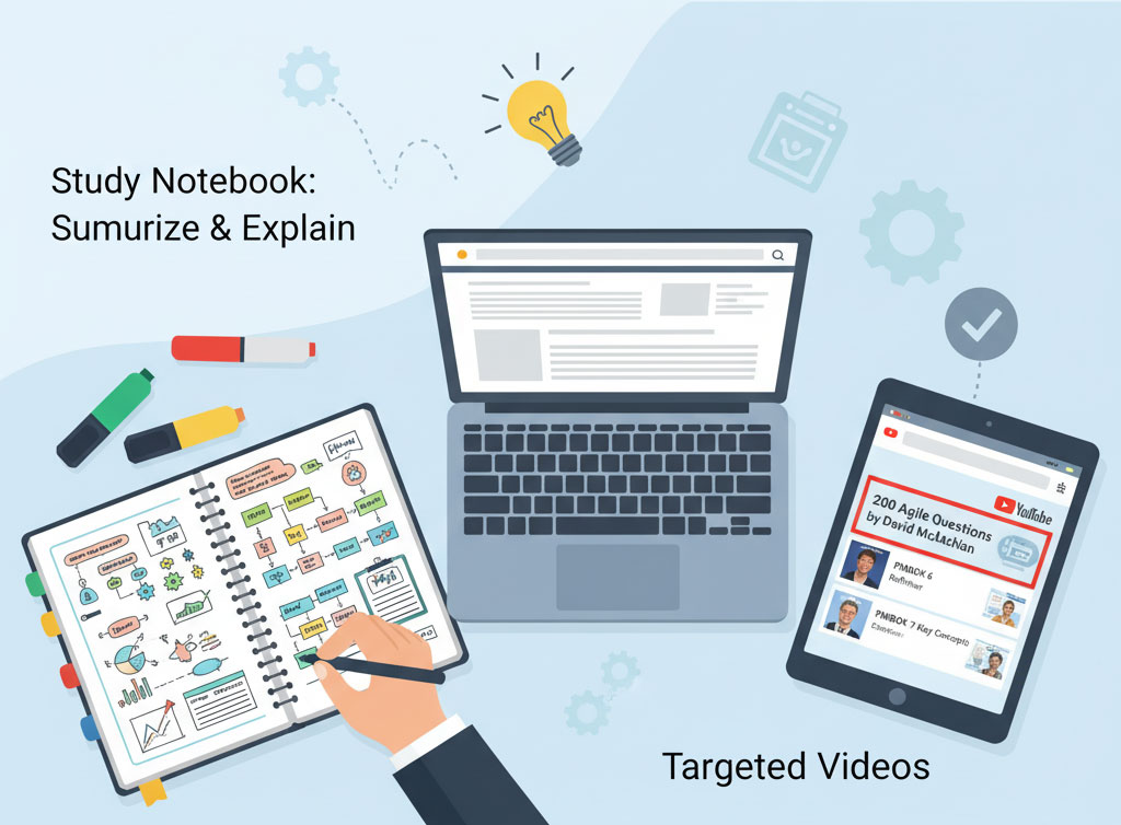 - Active Learning and Reinforcement: I’m a hands-on learner, so I kept a dedicated study notebook. As I went through the material, I summarized key concepts, drew diagrams, and wrote down my own explanations. This was the centerpiece of my learning. To supplement this, I watched targeted YouTube videos. The short reviews of PMBOK 6 and 7 were great for quick refreshers, but David McLachlan’s 200 agile questions video was an absolute game-changer. I can’t stress this enough: do not skip this video. The situational questions perfectly model the exam and are essential for developing the agile mindset.