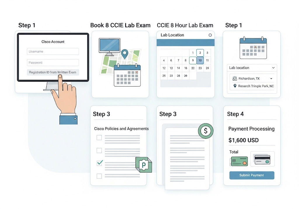 To schedule the CCIE lab exam in 2025, a candidate must first pass the corresponding technology core (written) exam for their chosen track. Once this prerequisite is met and the result is processed, the candidate can book the 8-hour lab exam through the official Cisco CCIE/CCDE online scheduling portal. This requires a valid Cisco account, the registration ID from the written exam score report, and the date the exam was passed. The process involves selecting a lab location and an available date, reviewing and accepting Cisco’s policies, and submitting the payment of $1,600 USD per attempt.2