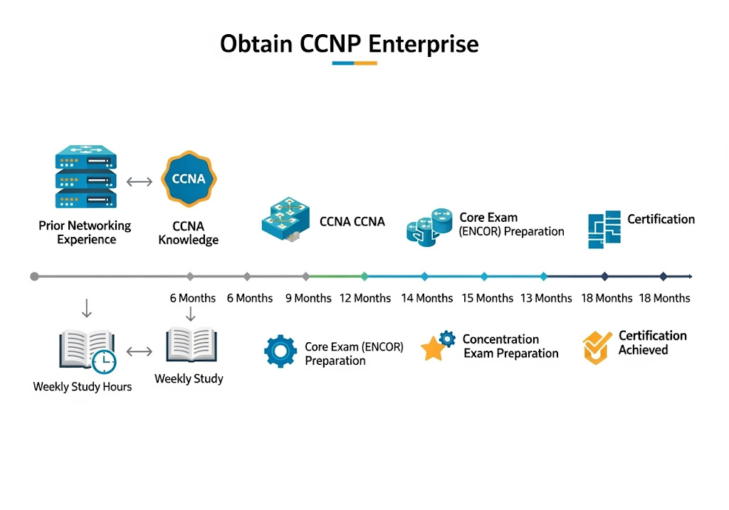 Obtaining the Cisco CCNP Enterprise certification, which requires passing both a core exam (350-401 ENCOR) and a concentration exam of your choice, typically takes between 6 and 18 months. This timeline is highly variable and depends significantly on your prior networking experience, the strength of your CCNA-level knowledge, and the number of hours you can dedicate to studying each week.