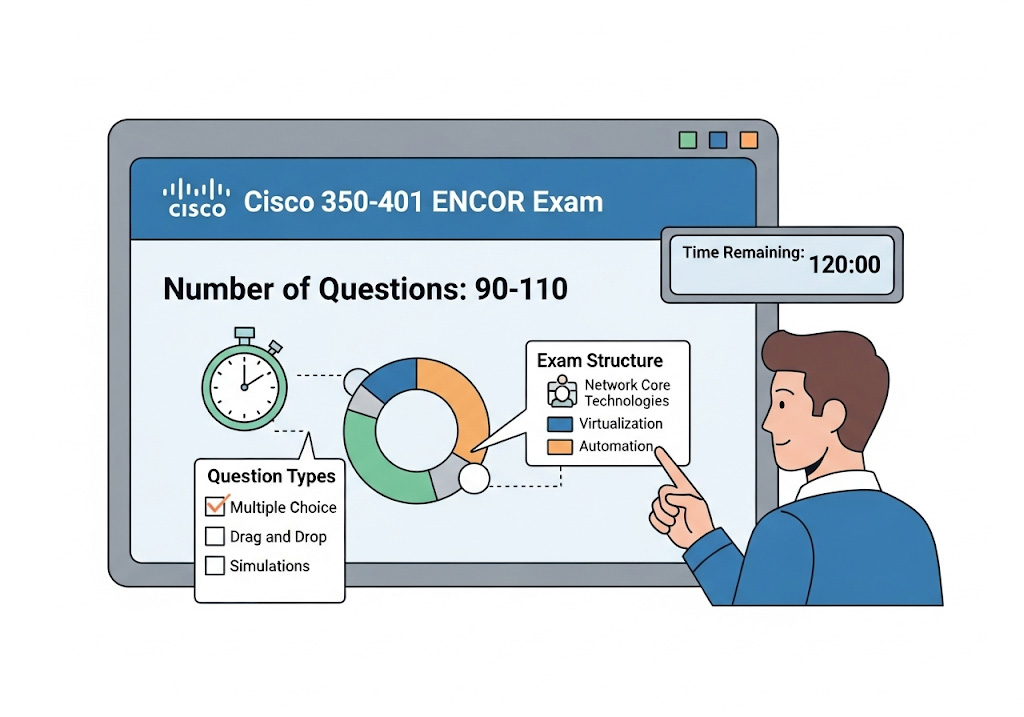 The Cisco 350-401 ENCOR exam officially contains between 90 and 110 questions.3 This range is the standard guideline provided by Cisco for its professional-level certifications and serves as a baseline for candidates to set their expectations regarding the exam’s length and pacing.
