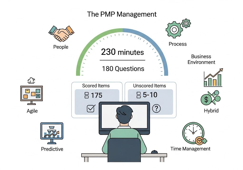 The PMP exam is a 230-minute test consisting of 180 questions, including a mix of scored and unscored items.1 The examination is designed to assess a candidate’s comprehensive understanding of project management across different domains and methodologies.2 To succeed, a candidate must manage not only their time but also the diverse question formats and the proportional content of the test.