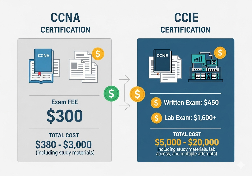 The total cost of a Cisco certification ranges from approximately $380 for a self-taught Cisco Certified Network Associate (CCNA) to over $20,000 for a candidate pursuing the Cisco Certified Internetwork Expert (CCIE), factoring in exams, premium training, and lab expenses.2 The foundational CCNA exam fee is $300.4 At the other end of the spectrum, the CCIE path involves a $450 written exam and a lab exam costing $1,600 or more, with the extensive preparation required representing the largest and most variable cost component.6