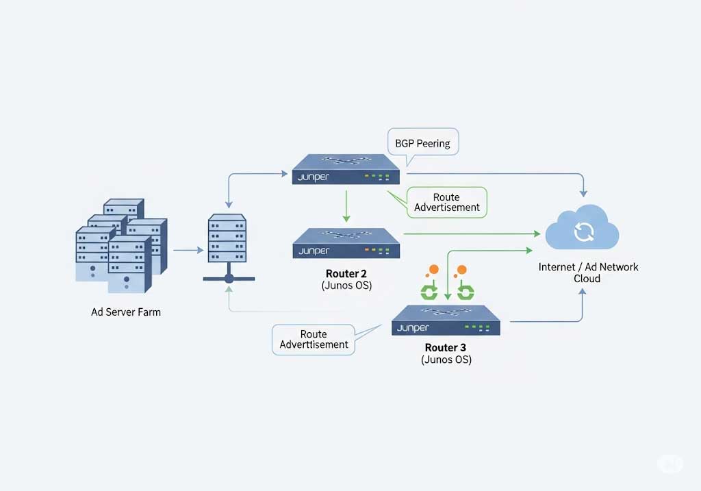 Advertising networks via BGP (Border Gateway Protocol) on Juniper’s Junos OS requires defining which prefixes you want to share with your peers and then applying export policies to your BGP groups. Unlike some platforms where you simply use a network statement under the BGP process, Junos OS leverages its powerful policy-options framework to control route advertisement. In the simplest form, you will: