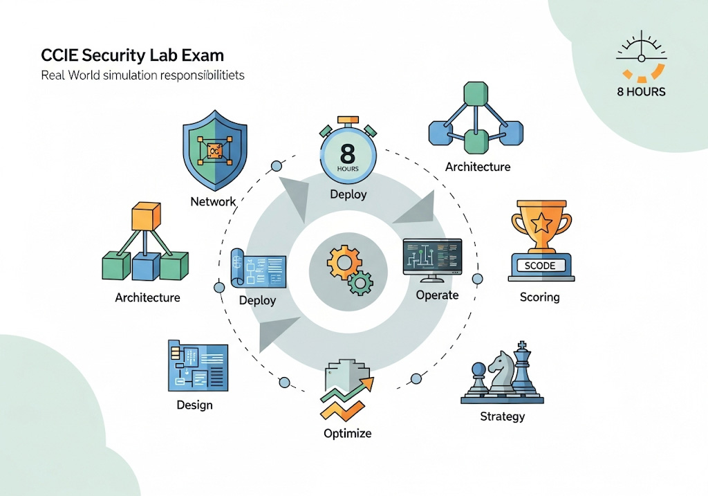 Before an architect can design a winning strategy, they must first understand the battlefield. The CCIE Security lab exam is more than a list of technologies; it’s a carefully designed, 8-hour simulation of an expert’s lifecycle of responsibilities.1 This section deconstructs the exam’s structure, content blueprint, and scoring logic to reveal what it truly tests: not just what a candidate knows, but how they design, deploy, operate, and optimize under immense pressure.