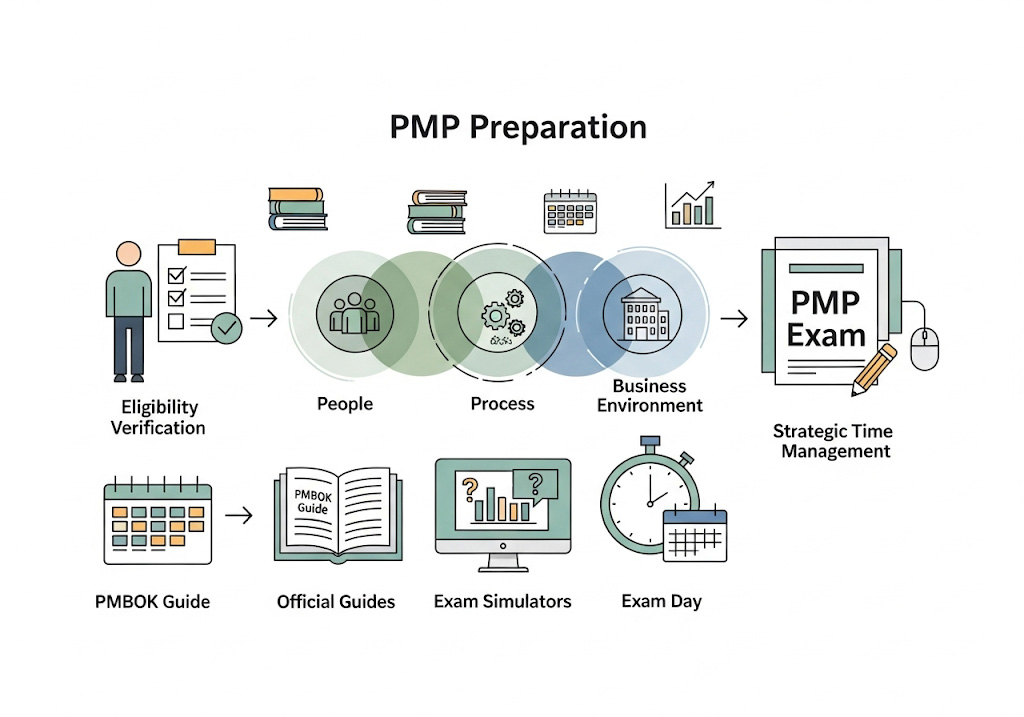 To prepare for the PMP certification exam, a candidate must first verify their eligibility, which requires specific hours of project management experience and education. Next, a candidate will master the exam’s content, focusing on the three performance domains: People, Process, and Business Environment. A strategic study plan involving official guides, trusted prep books, and realistic exam simulators is crucial. Finally, a candidate will apply strategic time management and mental fortitude on exam day to secure a passing score.