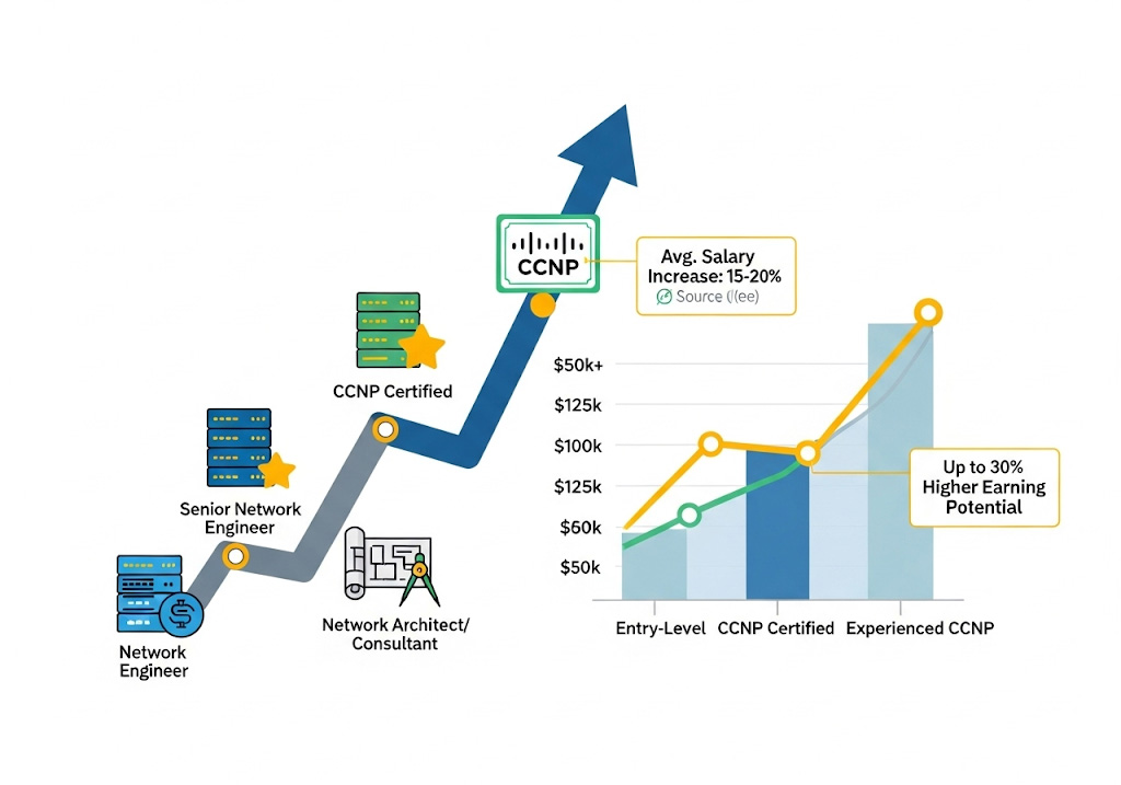 Earning a CCNP certification qualifies professionals for senior-level networking roles such as Network Architect, Senior Network Engineer, and Infrastructure Specialist, creating a direct path for career advancement. This progression is accompanied by a substantial salary increase, with average salaries in the United States ranging from approximately $98,000 to over $120,000 annually, representing a significant jump from CCNA-level compensation.2