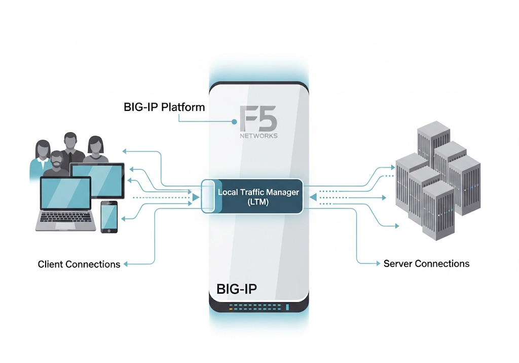 F5 Networks pioneered the ADC market with its BIG-IP platform, whose Local Traffic Manager (LTM) module remains the industry standard for load balancing and application delivery. LTM operates as a full proxy, terminating client connections and establishing new server connections to provide: