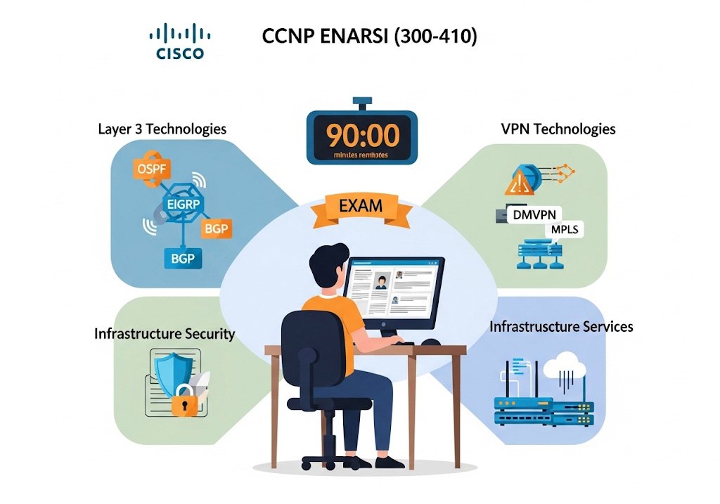 The CCNP ENARSI (300-410) exam is a 90-minute test that assesses a candidate’s expertise across four distinct, weighted domains: Layer 3 Technologies (35%), VPN Technologies (20%), Infrastructure Security (20%), and Infrastructure Services (25%).5 The curriculum focuses intensely on the configuration and, most importantly, the troubleshooting of advanced routing protocols such as EIGRP, OSPF, and BGP. Furthermore, it covers the implementation of essential VPN services like DMVPN and MPLS, and the methods used to secure network infrastructure and its foundational services.1